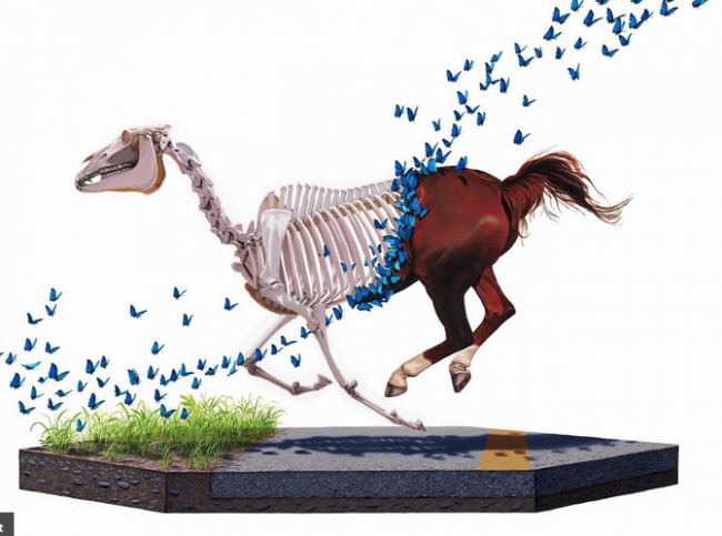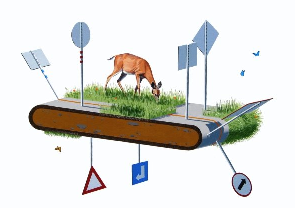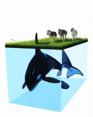 Josh Keyes' style is reminiscent of the diagrammatic vocabulary found in scientific textbook illustrations that often express through a detached and clinical viewpoint an empirical representation of the natural world. Assembled into this virtual stage set are references to contemporary events along with images and themes from his personal mythology. Josh Keyes' work is a hybrid of eco-surrealism and dystopian folktales that express a concern for our time and the Earth's future.