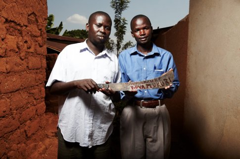 Innocent, left, killed Gasperd's brother during the 1994 Rwandan genocide. Now they stand together, reconciled, where the murder took place, holding hands. "Love is a weapon to destroy evil" is written across their arms.