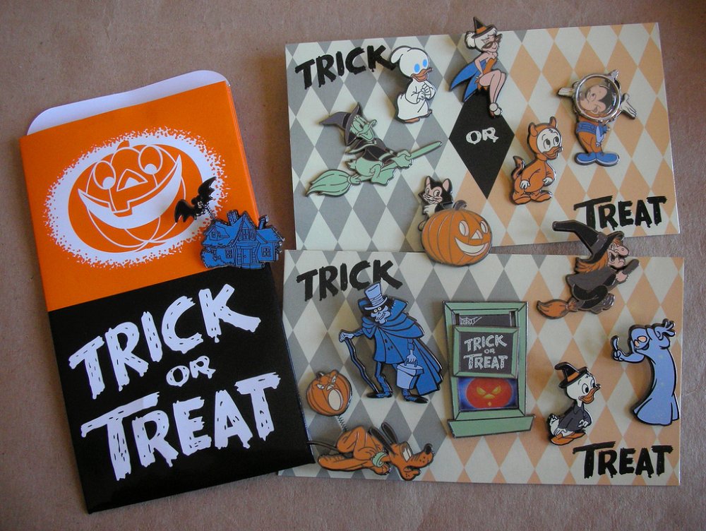 Disney Catalog Exclusive, 2004. Limited Edition of 1000. Thirteen Halloween-themed pins packaged in "vintage" Trick or Treat goody bags.Some of the pins were designed to perform a simple "trick" with moving parts, lenticular animation or glow-in-the-dark screens, etc. Also this was the very first appearance of the Haunted Mansion's Hatbox Ghost on "recent" Disney merchandise. His head rocks back and forth and his eyes glow in the dark.