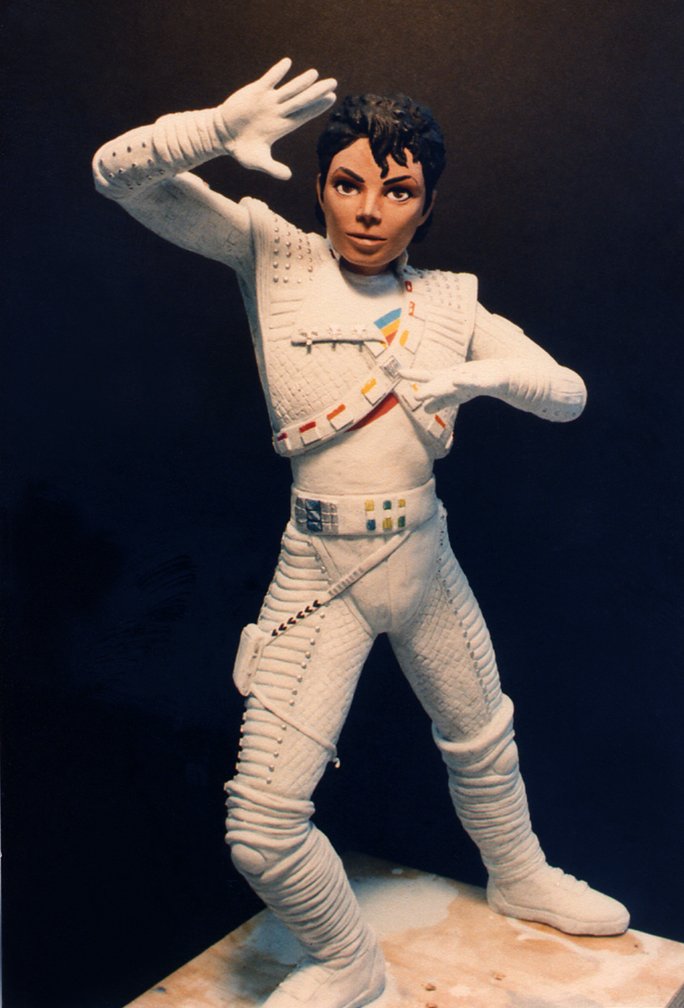This figure, created for a display in the Disneyland Showcase preview center on Main Street in 1985, was the public's first view of Michael Jackson in his role as Captain Eo.  The sculptures of Eo and his "ragtag band", displayed in a miniature setting from the film, were all made and painted by an enthusiastic  young  artist, Jason Bahret, of the Disneyland Entertainment Art Department.