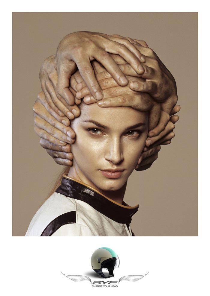 These are awesome ads promoting helmets for motorcyclists by the company Bye with the slogan "Change your Head." What a way of telling the truth!