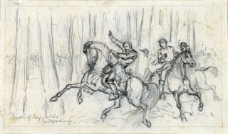Waud was with the Army of the Potomac for the duration of the Battle of Gettysburg, and a number of his sketches survive. Most of a sketch artist’s work would not make it to publication. The sketch usually provided the basis for a more elaborate engraving that would appear in print. Waud’s “Death of Reynolds” sketch is depicted here, with Reynold’s falling backwards off his horse, hat coming off his head. Keep reading article