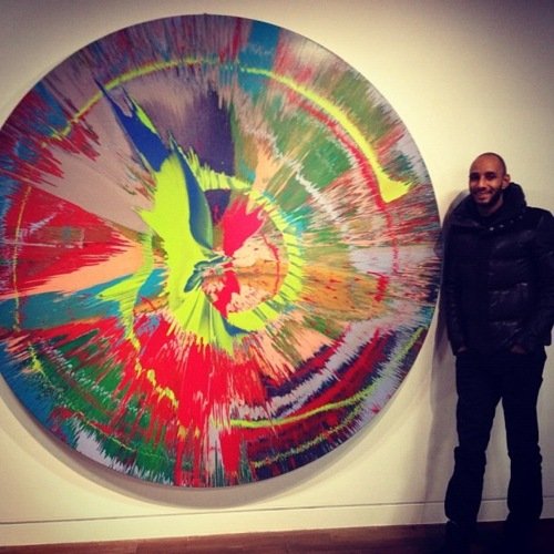 HIp hop producer Swiss Beatz is all smiles digging Damien Hirst's 'Spin Painting.' Let's check out some of his background see if he can afford a Hirst piece -