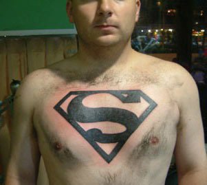 Now, it's all fine and well to have a Superman logo tattooed on your chest, but I hope to hell this guy is married, fit, and in a stable relationship. Because while I know a lot of girls who would "ooh" and "aah" at the tattoo, it kind of puts you into a position where you either have to cover it up all the way, or walk around bare-chested all the time. Having a shirt with a couple of buttons undone, revealing just the top is, well... Half-S'ed.