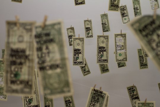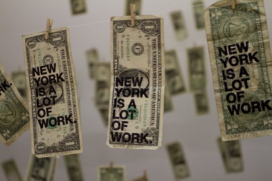 New York is a lot of work. is an edition of 1,000 real dollar bills emblazoned with a maxim, “New York is a lot of work.” The text is hand-imprinted with a high-gloss foil stamp.”