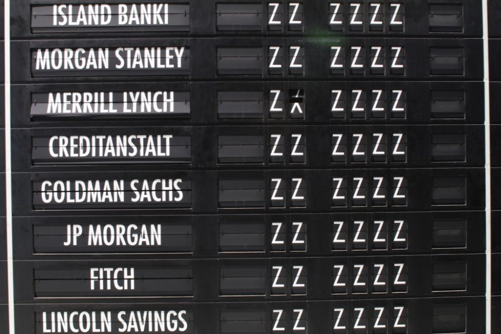 For his latest installation, called “The Family of Man” (a name appropriated from a mid-century MOMA exhibit from Edward Steichen), the big black-and-white sign flips and clicks, to tell us a new destination, a new time. On opening night, it included lots of repetitions of places, such as Providence (R.I.), and the same times, such as 6:66. Then, names of our corporate masters took the place of the “destination:” Wells Fargo, Merrill Lynch, Moody’s. Where, indeed, are we going?
