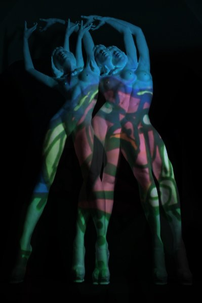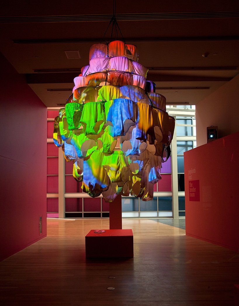 Installed in this smaller space, is 'Cape Cod Chandelier', a chandelier-like sculpture assembled from the collected undergarments of Rist's friends and family and upon which silent but richly colored video is projected. Stepping left into the main gallery, visitors are confronted with 'the tender room' multichannel video installation.