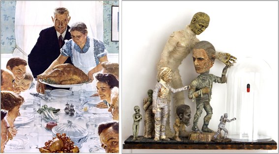 Left, Norman Rockwell, Four Freedoms-Freedom from Want, 1943 and right, Danny McDonald, Restricted Access to Medical Care (The Mummies), 2008
