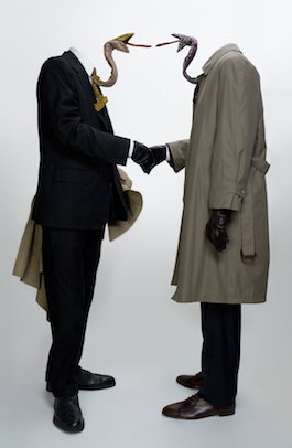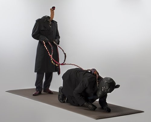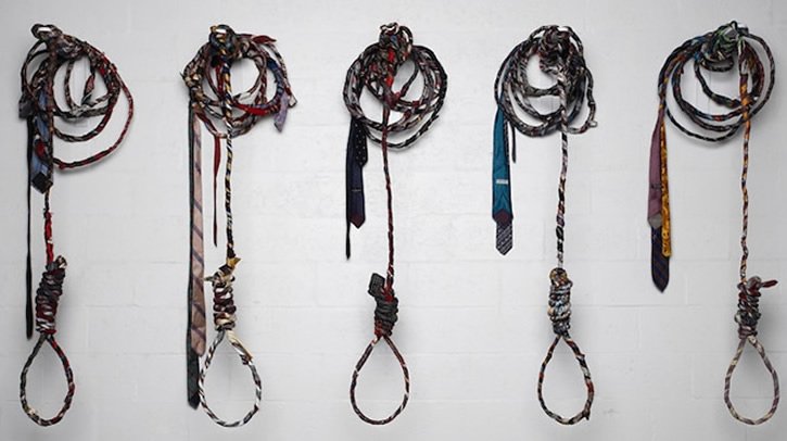 Personified by empty shells of clothing that appear to be void of human control and stylized to identify with the affluent and authoritative image of success, POWER TIES offers settings that illustrate the physically nonexistent nature of a ubiquitous dominion and its consequential stronghold on society in a story line characterized by neckties that represent unscrupulous misdeeds and the sacrifices one makes for personal gain”… Guerra de la Paz.