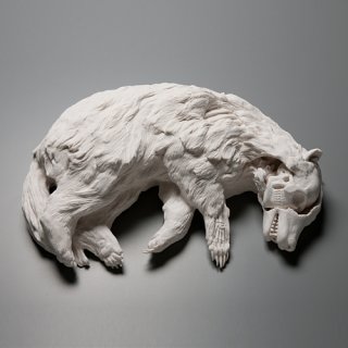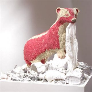 "In my work this romantic ideal of union with the natural world conflicts with our contemporary impact on the environment. These pieces are in part responses to environmental stressors including climate change, toxic pollution, and gm crops. They also borrow from myth, art history, figures of speech and other cultural touchstones. In some pieces aspects of the human figure stand-in for ourselves and act out sometimes harrowing, sometimes humorous transformations which illustrate our current relationship with the natural world. In others, animals take on anthropomorphic qualities when they are given safety equipment to attempt to protect them from man-made environmental threats. In each case the union between man and nature is shown to be one of friction and discomfort with the disturbing implication that we too are vulnerable to being victimized by our destructive practices."