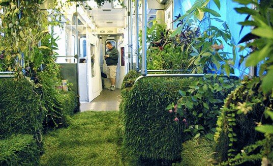 Most recently, Chicago’s Art on Track festival transformed a subway train into a movable art gallery of multiple installations by over 50 artists, from thematic rooms to choreographed performance pieces. The standout project, the Mobile Garden Car by noisivelvet, covered one of the train car with a thick carpet of greenery, including plants and sod donated by local . The moving greenscape looped around Chicago’s downtown for 5 hours, inviting commuters to sit on seats lined with bushy lawngrass and potted plants or stand amid tall grass and hanging ivy.