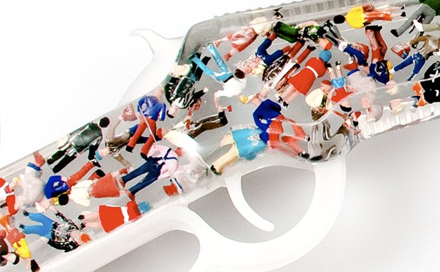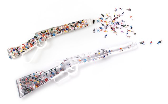 GUNS (2009). Sculpture, resin and found objects, 15x79x60cm. No human hands pull the trigger. The gun/mob appears to take on a life of its own. Guns induces a sense of sadness and helplessness. Limp, wasted, lifeless miniature people suggest the impotence of war. The work impacts by using visual ambiguity. The multitude of colours implies playfulness, only to induce, on closer scrutiny, confusion and doubt.