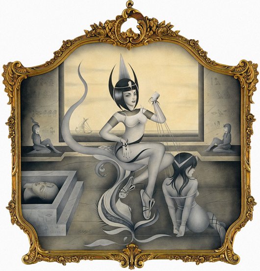 Inspired as much by dreams as by chance encounters with complete strangers, his beautiful creatures with their pensive and melancholy expressions, evoke feelings of love, sadness and longing. Dark-haired figures dominate sparse backgrounds giving the impression of characters alone in the desert or even outer space. Spanning time as well as space, Rubino draws on sepia toned paper and attires his subjects in anything from Victorian dresses to S&M spiked heel black leather boots. These juxtapositions give his works a timeless quality that adds to the eeriness and universality of their appeal.