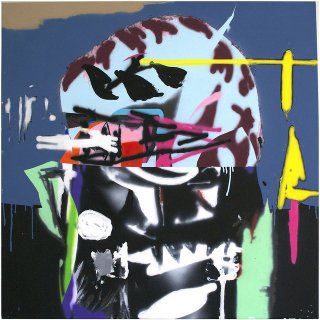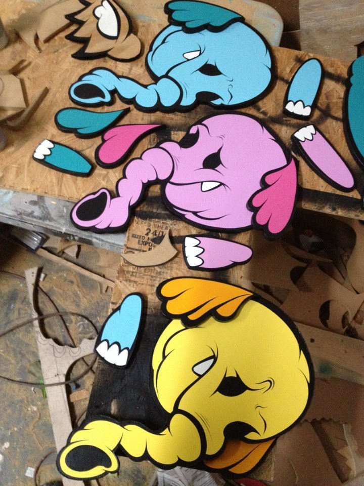 Along with vivid colors, he uses bold outlines to define his intricate figures. His most recent works are mixed media, three dimensional images. This process consists of drawing then cutting the image out of panels using power tools. Once they are cut, the individual pieces of the puzzle are sanded and painted using a mixture of acrylic , spray enamel and epoxy resin. Finally , the pieces are attached in multiple layers, revealing a multi-dimensional experience. Yanes is represented by Michael Margulies.