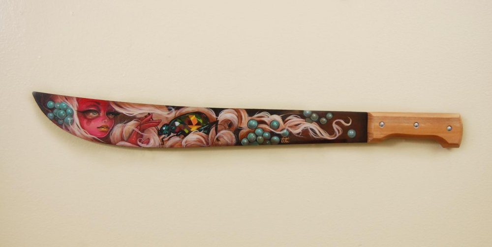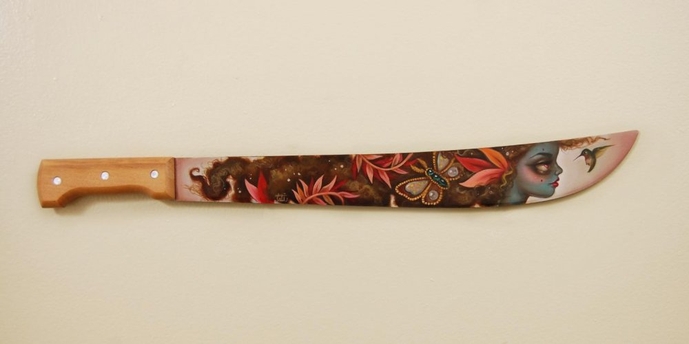 Tati Suarez is an artist/illustrator that works from Brooklyn, NY by way of Miami, FL. Her work pulls from pop surrealism and imagery of the Brazilian orisha Yemanjá. She incorporates her own personal motifs of bugs, fruit and wildlife into the long, at times curly hair of goddess figures that end up as oil canvas paintings and giant murals. The image in this post is titled " Caiubi " Oil on Machete 2012. Via: Tati Suarez