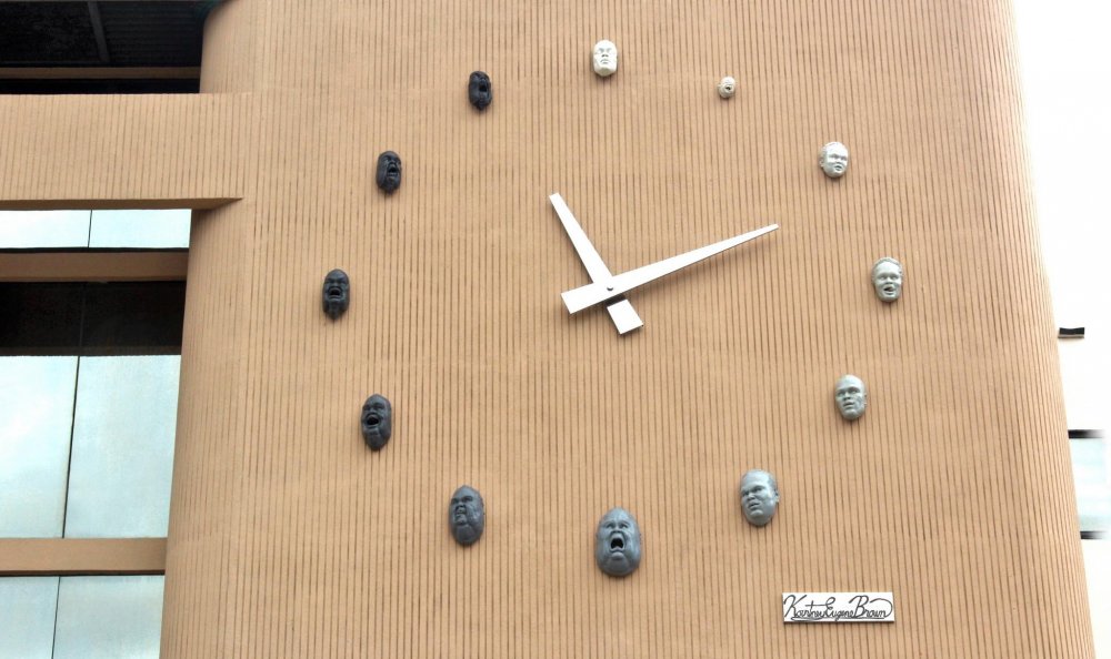 A better view of "Creos Aetas" Timepiece Installation, Borinquen Healthcare Center Headquarters, FL. These joyful yet menacing heads make up this interesting clock right in the center of Miami’s design district. As each hour passes the heads go from light to dark literally and figuratively. Brown lives and works from Miami, FL. He is also an active Freemason.