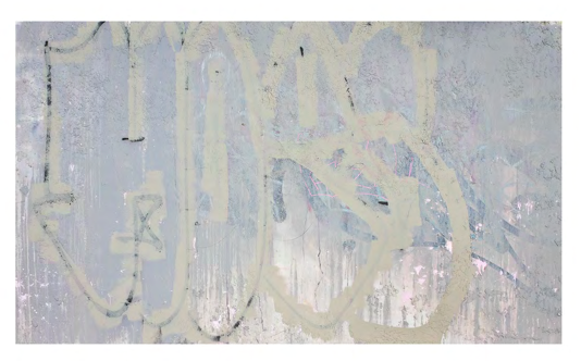 His painterly gestures incorporate concrete elements, acrylic, enamel, oil, compound and ink, creating overlapping styles of free-floating patches of color, otherwise known as buffs. He actualizes four stylistic forms of buffs in his paintings: symmetrical - which are recognizable geometric squares and rectangles, ghosting - in which the remover traces the lettering but the general form and shape is emphasized, radical - the remover uses neither geometric nor guide lines to remove the writing often referred to as an outside the lines removal, and blur - when the remover uses paint stripper and a cloth to wipe the writing but leaves a cloudy appearance on the wall. Through his elaborate process of building up and tearing down art, Martinez's paintings boldly invite the viewer to experience the daily conversations the urban environment carries on with its inhabitants.