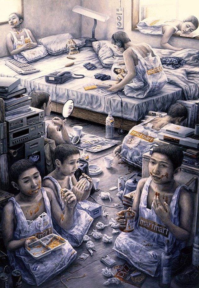 I Just recently discovered the works of Japanese artist Tetsuya Ishida. He died very young after being hit by a train, from a possible suicide but nobody is really sure. Tetsuya painted scenes of ordinary life in Japan. He would alter figures to look like machinery or treated as part of a production line. He gave his painted people the sense of being overworked like cattle or like robots.