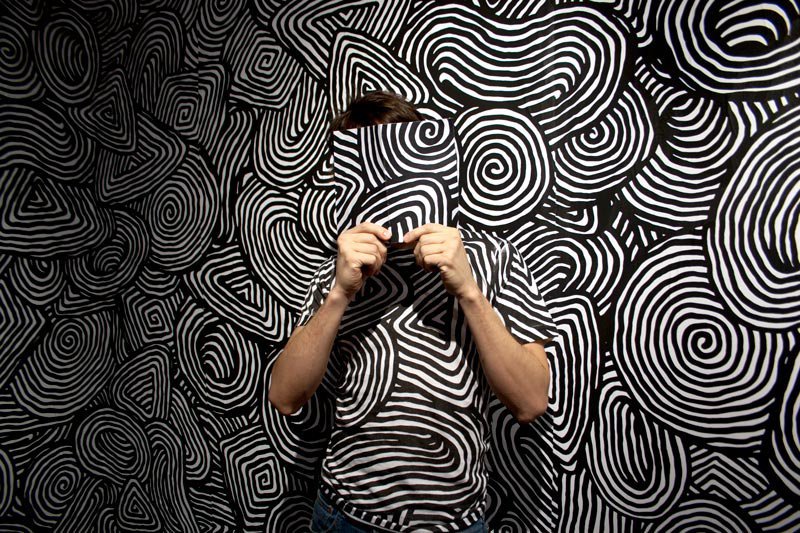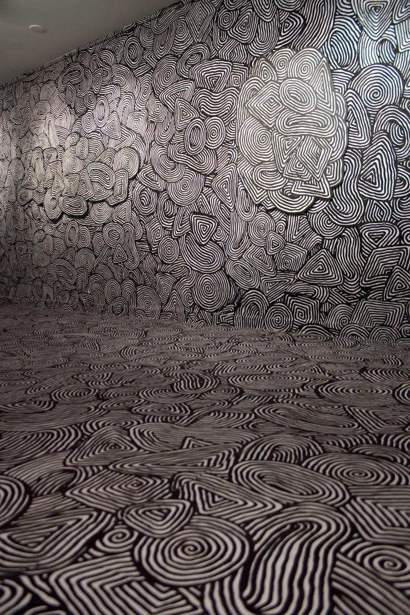 "For this show I explored space, patterns, and the energy that lies in-between. I painted black and white patterns on amorphous wooden pieces which hang on an identically patterned wallpaper. The wood paintings' swirling lines blended into the background, becoming one with the environment. Contrasting line work created a visual vibration causing tension within the space. Through this I wanted the viewer to be aware of the spatial energy that lies between oneself and the object" - Freegums