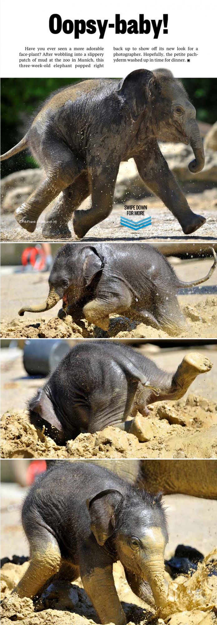3 week old baby elephant plays in the mud at the zoo in Munich and face-plants but gets up quickly and continues his playful journey.