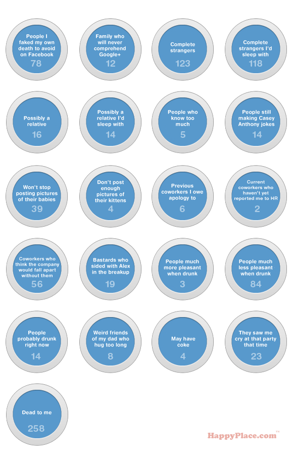 This pretty much nails the typical "friends" on social media. Now with Google+ we can put them into "circles" of "friends." These social circles pretty much say it all. This has been made by the fine folks at HappyPlace.com
