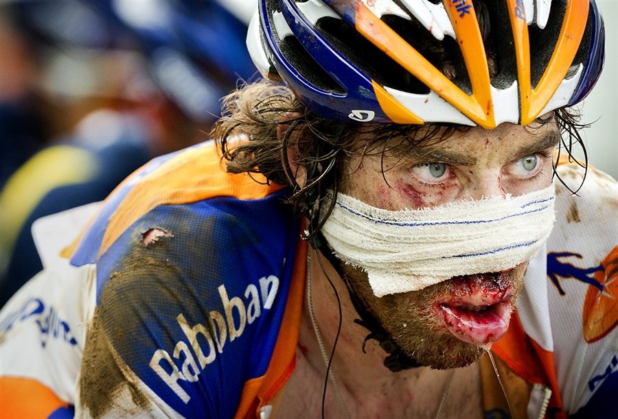 Dutch Rabo rider Laurens ten Dam is covered with blood after he crashed descending from the Col d'Agnes mountain pass on July 16 during the 14th stage of the Tour de France cycling race from Saint-Gaudens to Plateau de Beille. The Dutch rider finished the stage with gauze wrapped around his face to cover his bloodied nose.