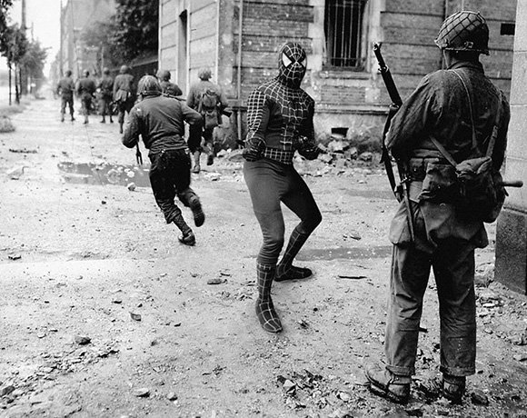Where the hell is Mary-Jane Watson? My Spider senses tell me she's near. But those damn bombs keep dropping and it's hard to figure it out. Once I find her...I'm after Hilter. Enough Already! - Spider-Man