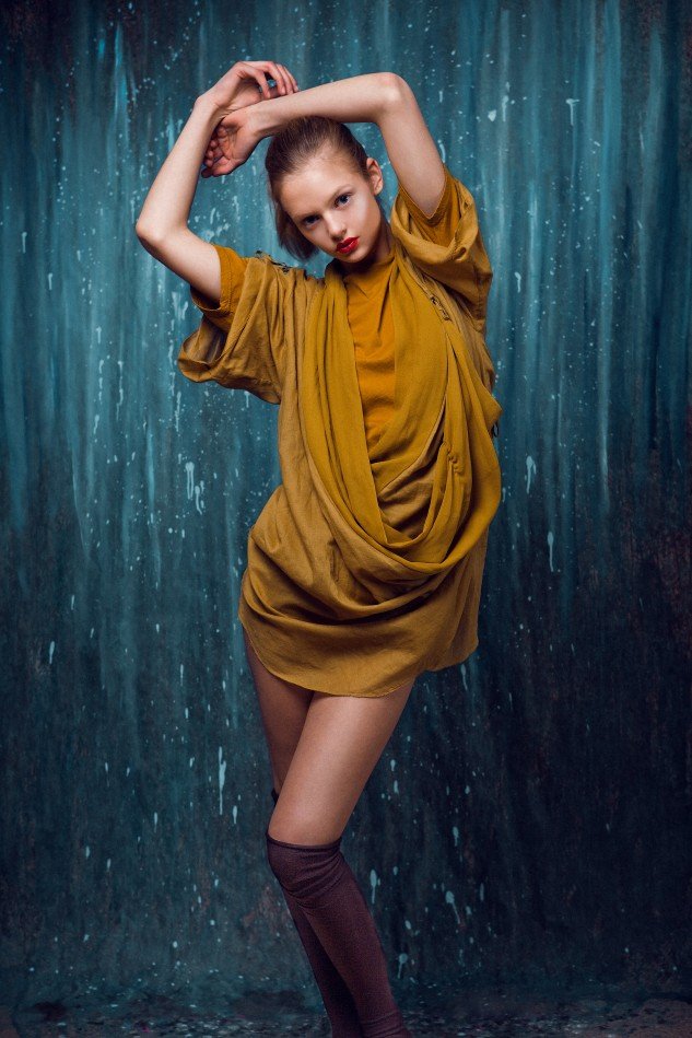 Creating contrasts in outfits makes overcast colours come to life. Referencing the Halton classic dresses of the 1970’s, Vanja layers with a comfortable jersey fabric t-shirt under a stylish dress. Thus she creates a monochrome effect with exciting textures while exuding a dressed down and comfortable style. However when adding purple cotton stockings, the mustard coloured dress take on a life of its own.