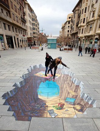“ I’m a street painter – I draw things with chalk pastels on pavement; streets, plazas or sidewalks in urban public areas. I have a passion for manipulating 2D surfaces to reveal an unlikely alternative in 3D, typically designing and creating interactive images which invite the viewer to become part of my imagined world. As a result, communicating through this manner of direct participation has certainly become the keystone of my philosophy on being a visual artist.