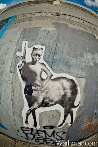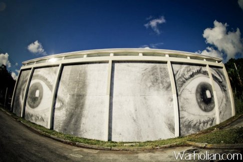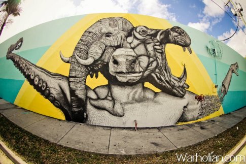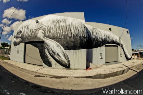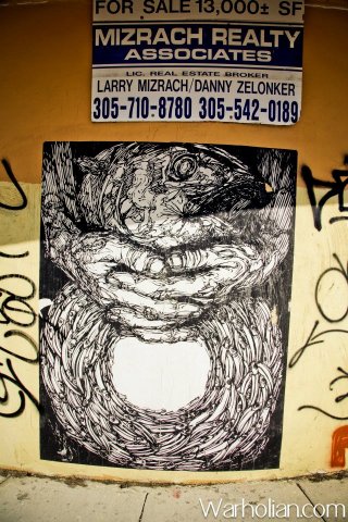 the documentation of his activities as he updates in Facebook, Livestream and other social media network tools, using photos and videos shows the beginning of his craft making to the finished artwork. He always go back to the street location where he has worked and documents the scene, and shares it with us. Sometimes his artwork is ripped down within 24 hours.- see the left hands side for one of the most recent work he has put on a Wynwood wall. This is quite a ride if you start to follow his activity and share the thrill and feel his adrenalin rushes.