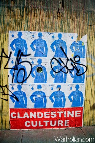 It has been about a month since I sent him a Facebook friend request and became "friend". I am fascinated by street art in general lately, but when I saw the images posted in his Facebook "CLANDESTINE CULTURE", I saw what I been longing to see for quite some time. Following his street activity admirering his artworks became my obsession and I don't know how to articulate the reason why I am so attracted to his works in a emotional level. Images he creates have a minimum amount of colors, so they have a strong visual impact. His bitmap skill is superb. The font he uses is always clean and dynamically simple. His model choices are always quite tasteful.