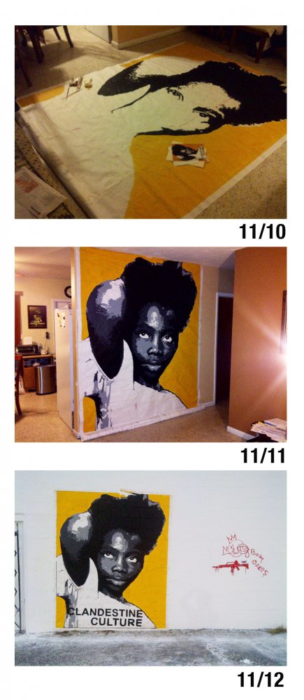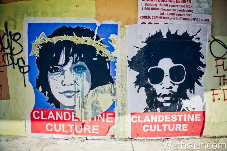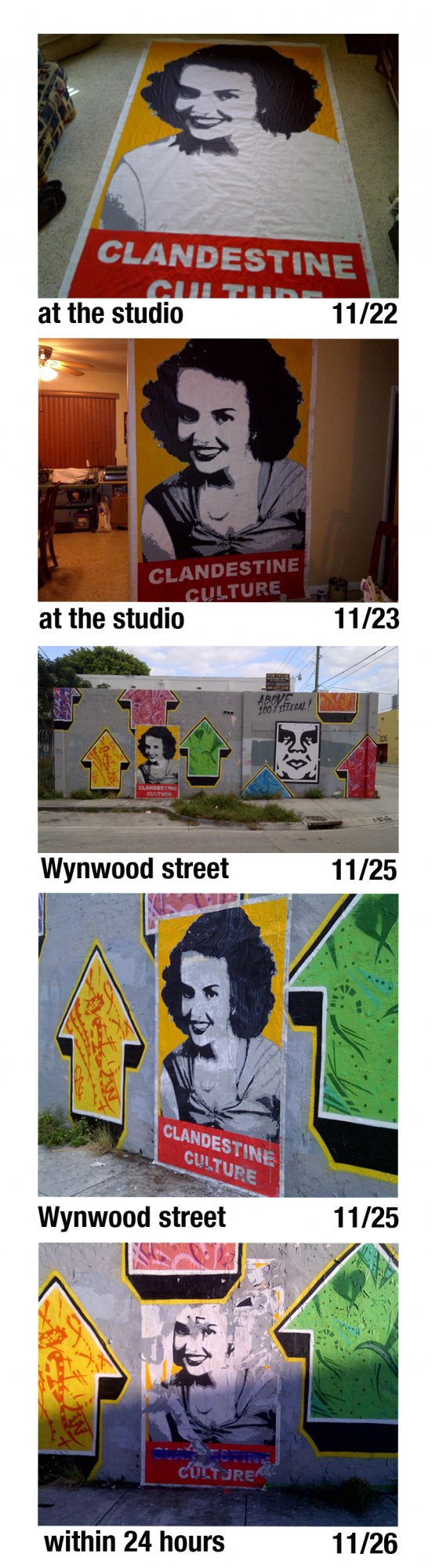 It seems to me that CLANDESTINE CULTURE is a challenging street art project must be uncommissioned in order to NOT to be controlled by anyone, any instutution, any authority. and on top of that, he has got this location risk: Miami Wynwood district, and the challenging size (his large poster to be 8ft-11ft tall), most parts are hand painted by him.