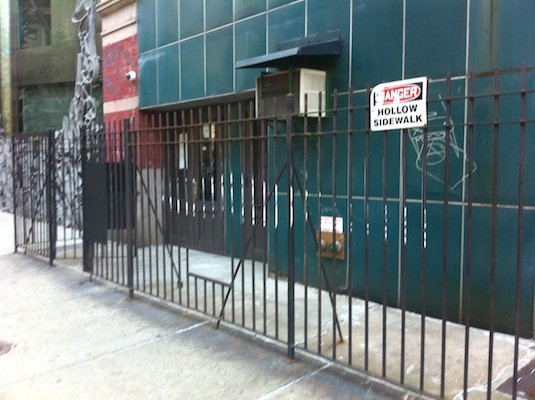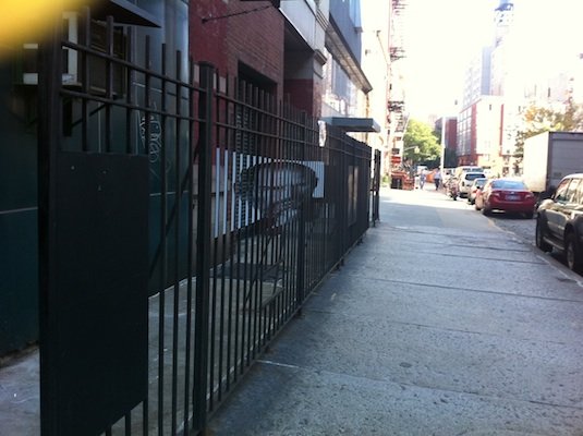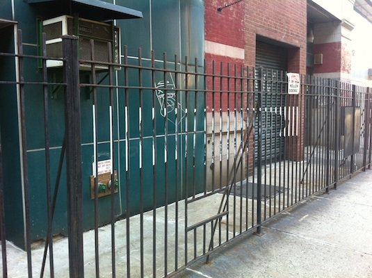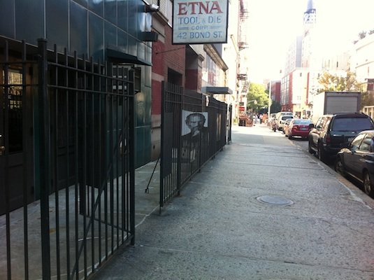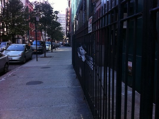 Clever optical use of a vertical-rail fence for some sliced-up wheat-paste street art images of the late Apple co-founder and CEO Steve Jobs in NoHo, in downtown New York City.