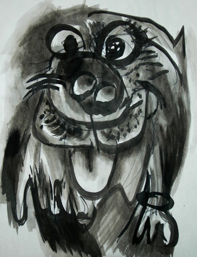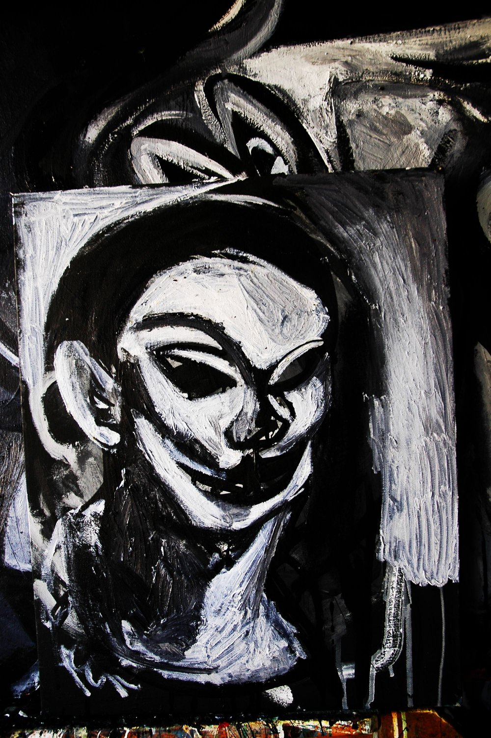 I'm painting mostly black and white portraits still. I'm doing that and bouncing over to more cartoon inspired imagery...but making sure the paint is really heavy and thick. The painting below is a portrait titled "Indra Vanslow."