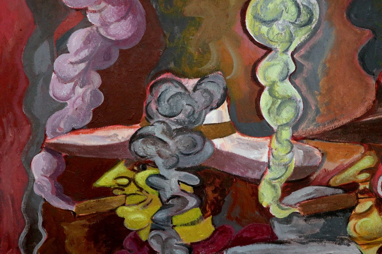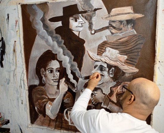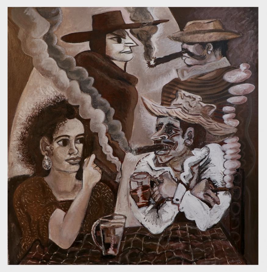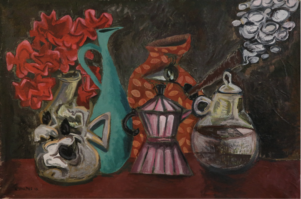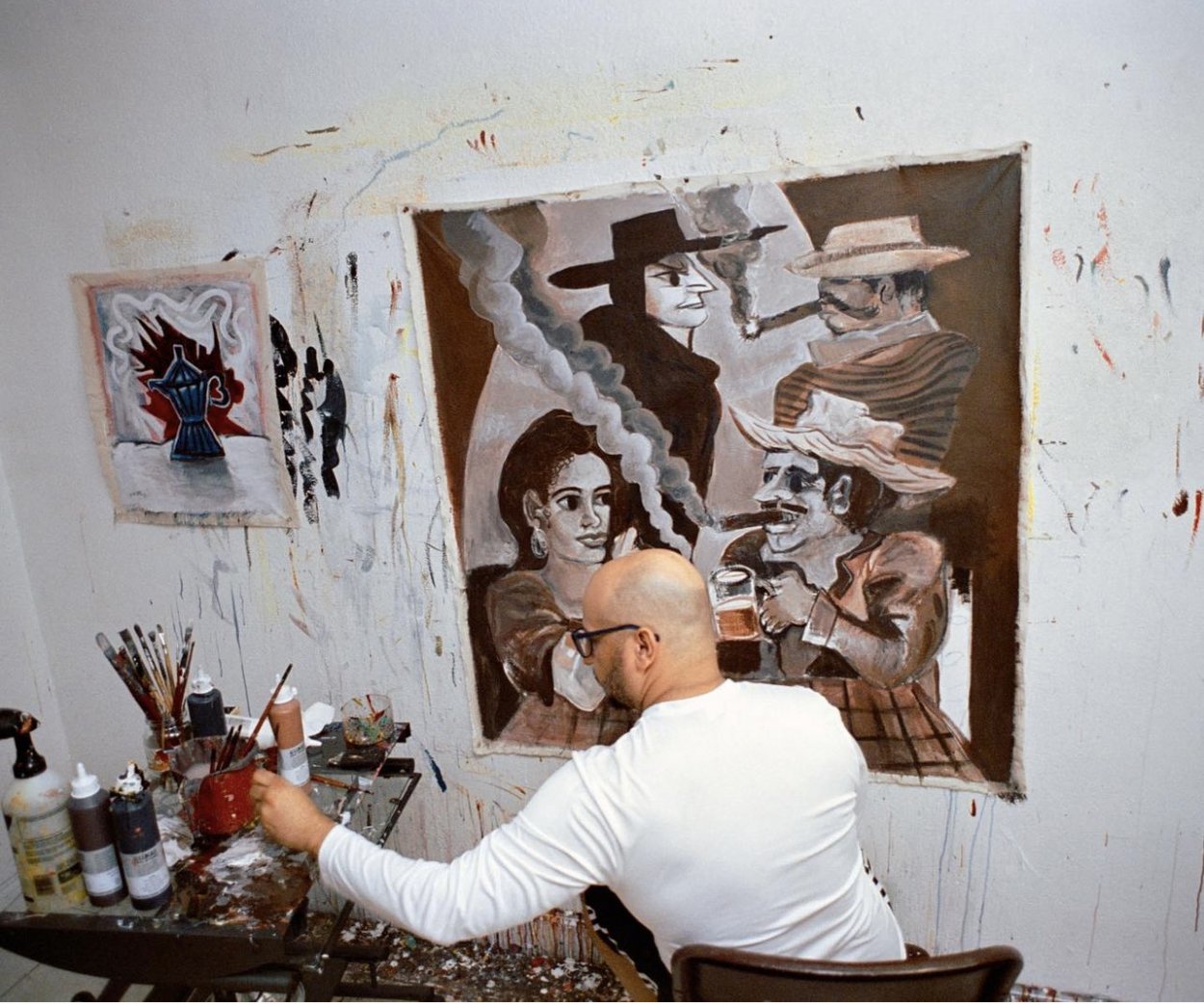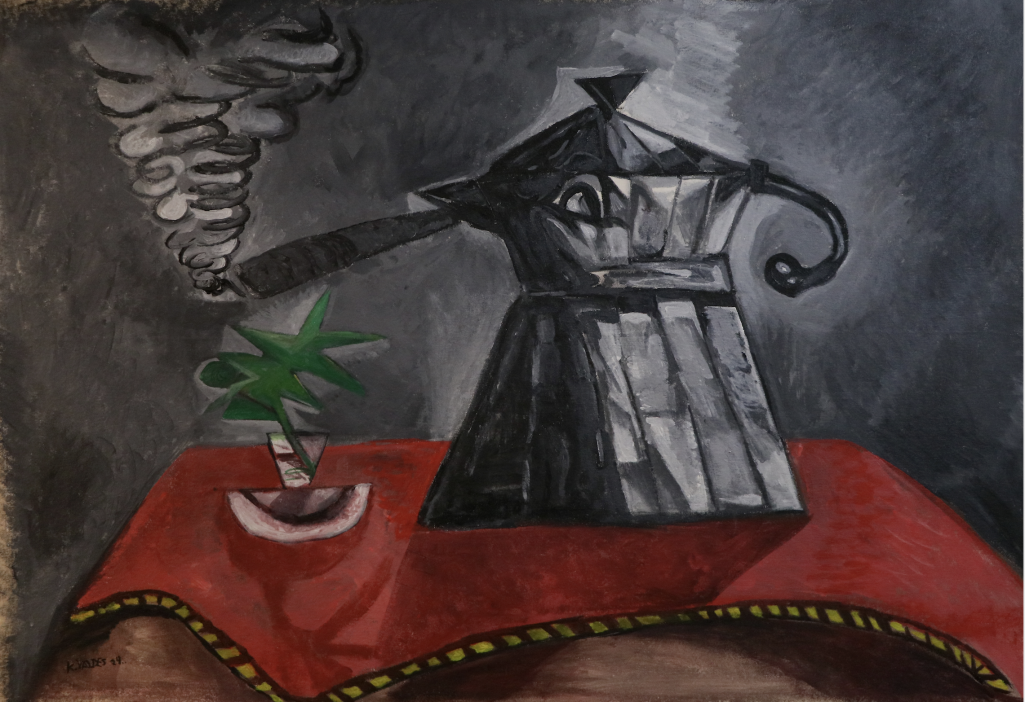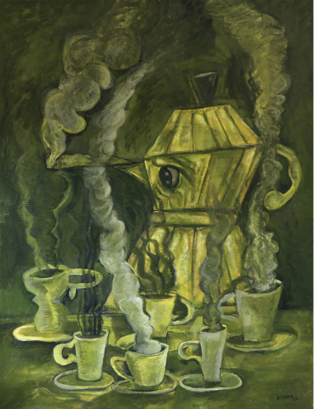 These are the first two still-lifes I painted at the beginning of the year. I was pretty happy to be back in the studio because at the very end of 2023 I got the flu and didn't feel like painting much. These two pieces show a continuation of adding personality to coffee pots. For a reason I'm still developing I made the moka pot in the first painting and the second piece with the poka dot ceramic pot smoking cigars. Growing up all the older men around me smoked cigars, I think it just sort of stayed with me. People still smoke cigars, however back then, it was different. Growing up these guys smoked cigars like how people drink coffee everyday...it was all over the place. It was in the culture in a way that does not feel the same today.