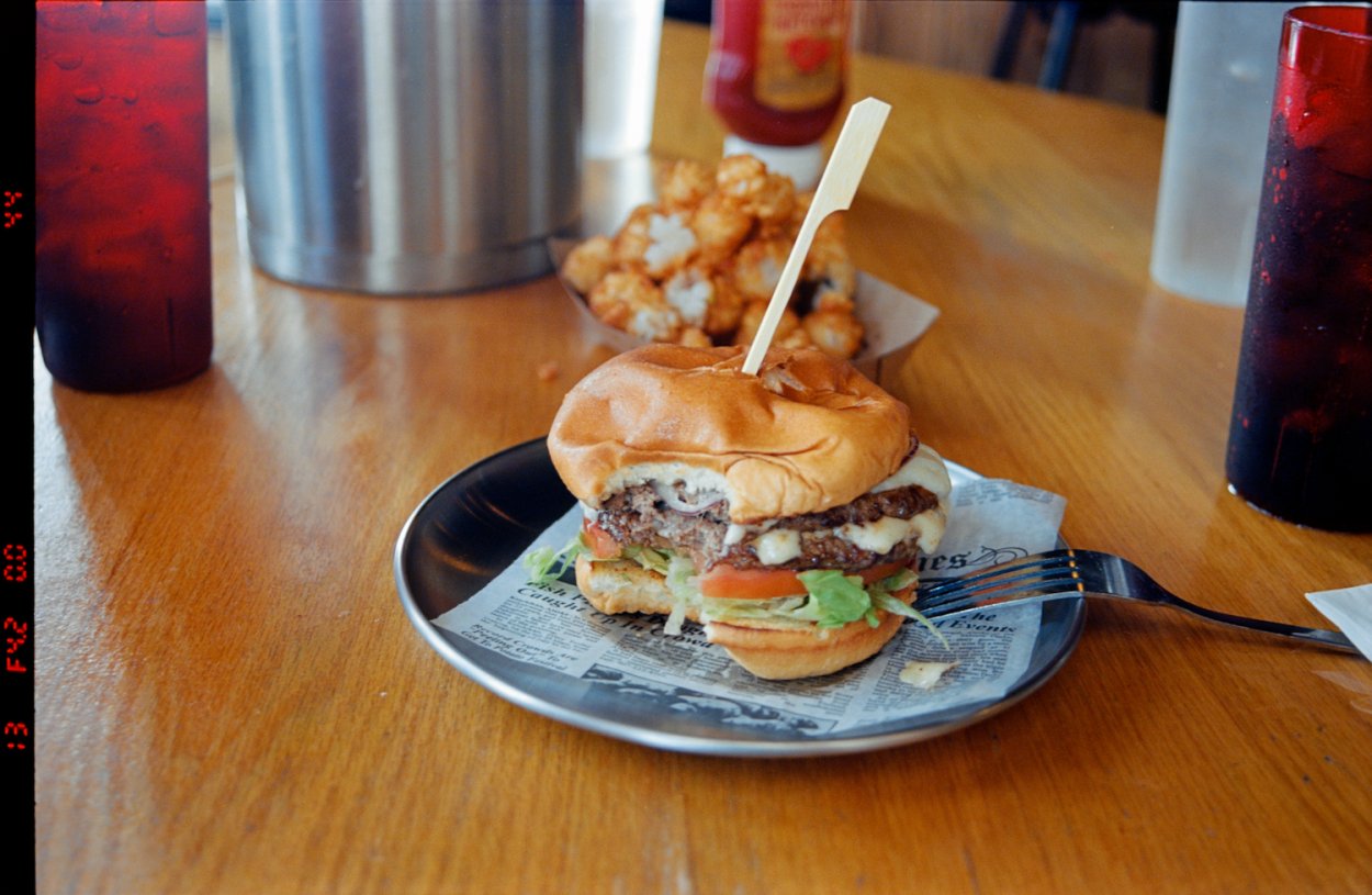 A pretty good cheese burger with hash browns on the side from Cowgirl Kitchen. Rosemary Beach, Florida!