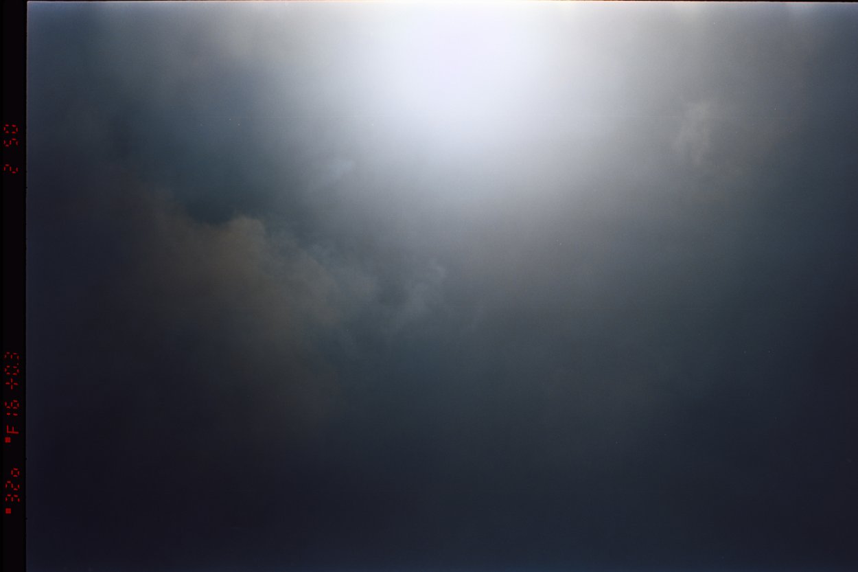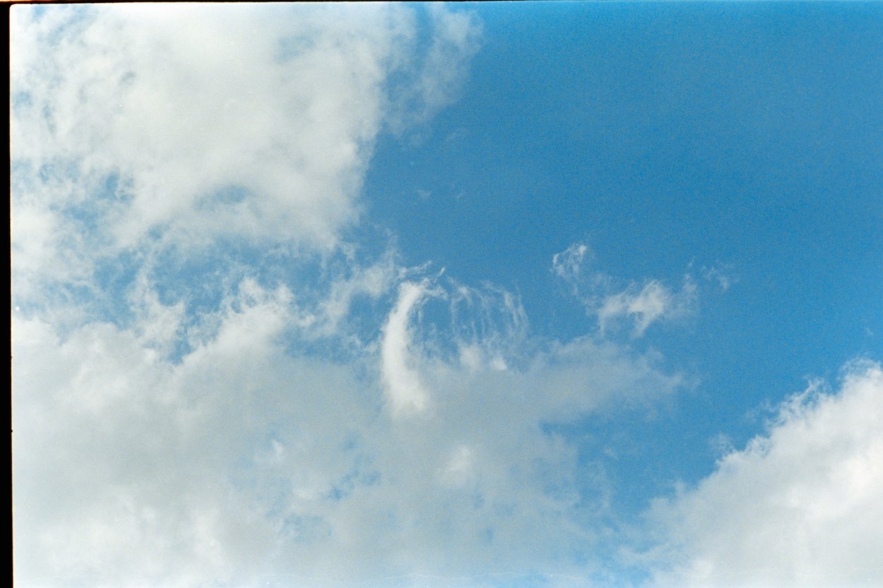 Dark storm clouds cover half the sky as the last streaks of sun light hits the blue sky as the sun sets. Captured on film, Kodak Portra 400 on the Nikon F80s with the Voigtlander Ultron 40mm f/2 lens.
