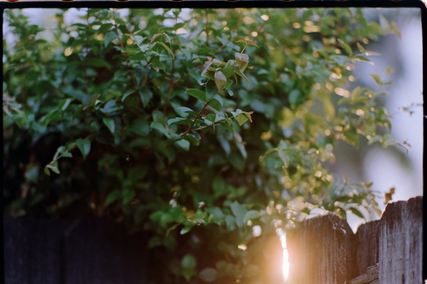 Golden hour sunsetting light piercing through a wood fence with overgrown cherry hedges spilling out from the top.