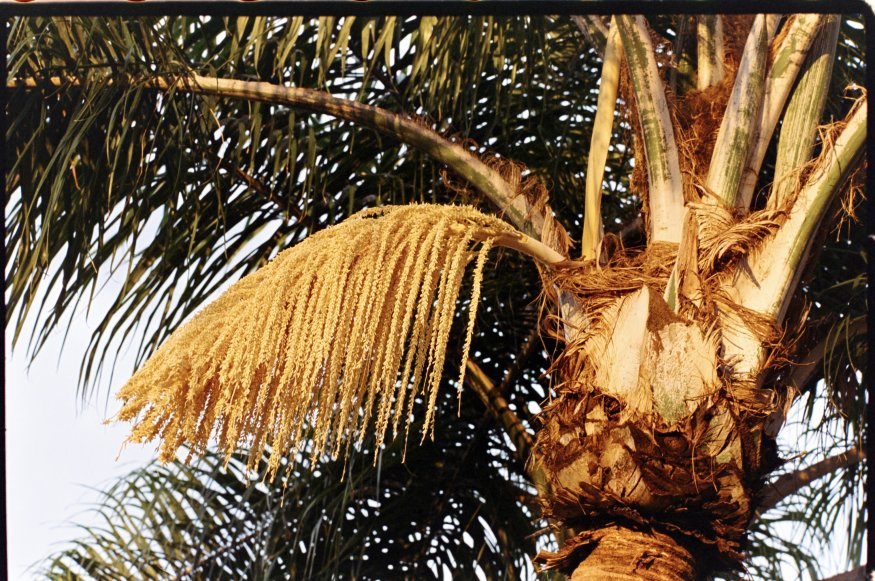 Palm tree with fresh seed pods glowing in warmth from the last bit of golden hour light.