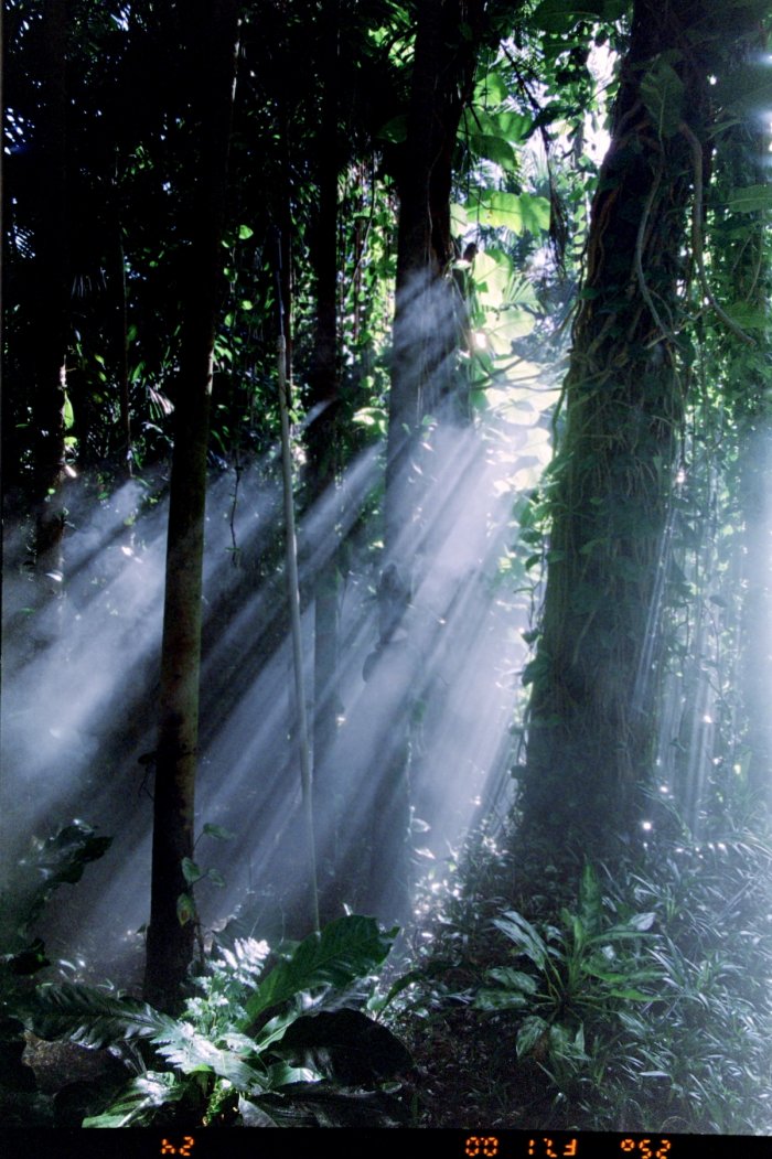 The tropical trees loomed tall and majestic, their verdant leaves shimmering. A thick mist hung in the air, wrapping the trees in a ghostly embrace. The light from the rising sun peeked through the mist, casting a golden glow over the landscape.