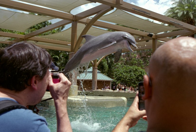 Dolphin jumping in the air at Seaworld Orlando. FujiFilm Superia X-tra 400 Film. Nikon F80 with Voigtlander 40mm manual focus lens