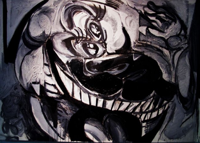 I've been doing cartoon based drawings with india ink for the past year. This is my first attempt at this new form of painting for me. It's a mixture of expressionism and cartoon imagery from my childhood. I stopped painting women in the traditional sense and started using something more playful and nostalgic to pull new viewers into some of the same type of issues and themes I’ve been experimenting with for the past 5 years.