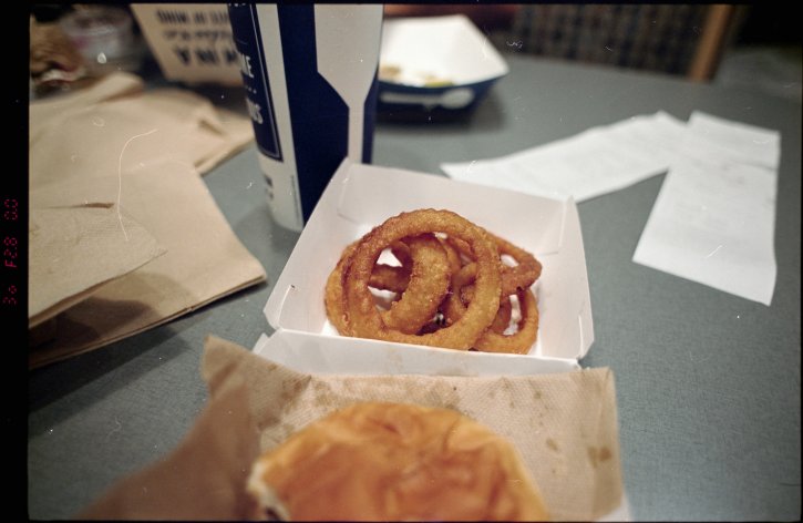 Onion rings from Culver's. Kodak Vision3 250D, Nikon 24mm f/2.8 D, Nikon F80s.