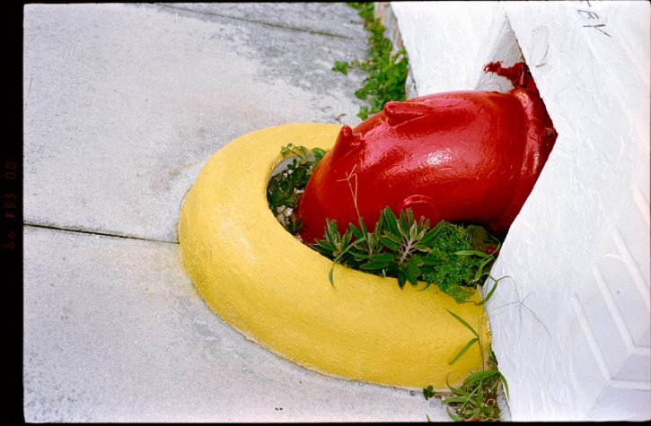 Red pipe(s) goin into and out of the ground Kodak Vision3 250D.