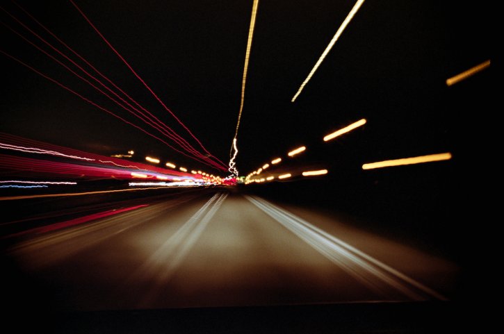 Long exposure light trails road blinking yellow. Kodak Vision3.