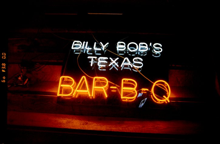 Billy Bob's Texas Bar-B-Q neon sign. Kodak Gold 200 film.