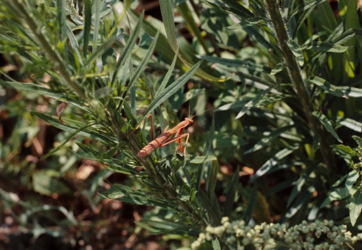 Orange praying mantis on Kodak Ektachrome E100 slide film.