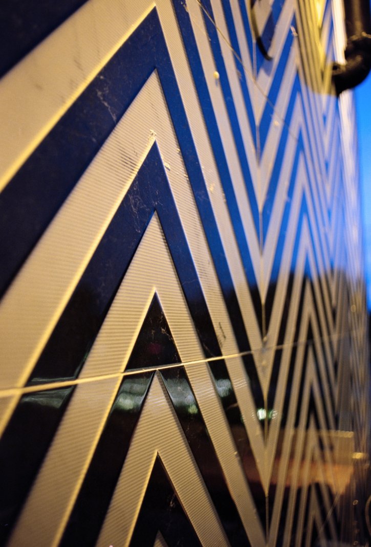 A faded neon sign clinging to a cracked blue wall and not turned on. Might have been broken. They one next to it was on and looked similer in style... A turned on and working neon sign with a vibrant mix of blue and pink/orange light. Shot on Kodak Vision3 250D film.
