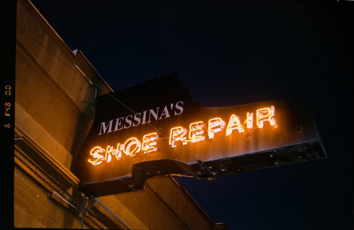 Messina's Shoe Repair neon sign. Grapevine, Texas 2024. Kodak Gold 200 film. Nikon F80s.