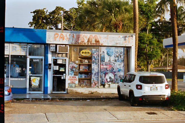 A & M Comics & Books, Bird Road - Miami Florida, with golden hour light. Kodak 5207 movie film.
